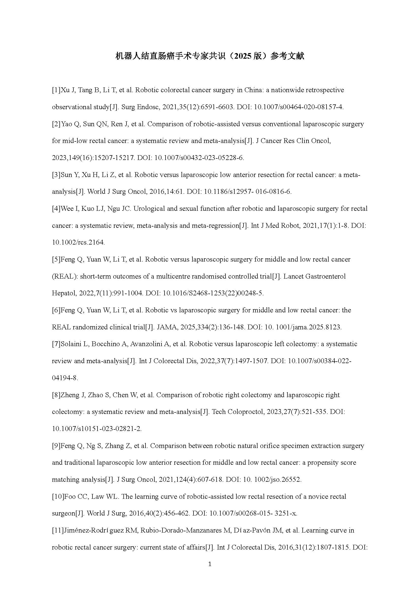 引用文本:中国医师协会结直肠肿瘤专委会机器人外科学组. 机器人结直肠癌手术专家共识(2025版)[J/CD]. 消化肿瘤杂志(电子版), 2025, 17(4): 411-428.