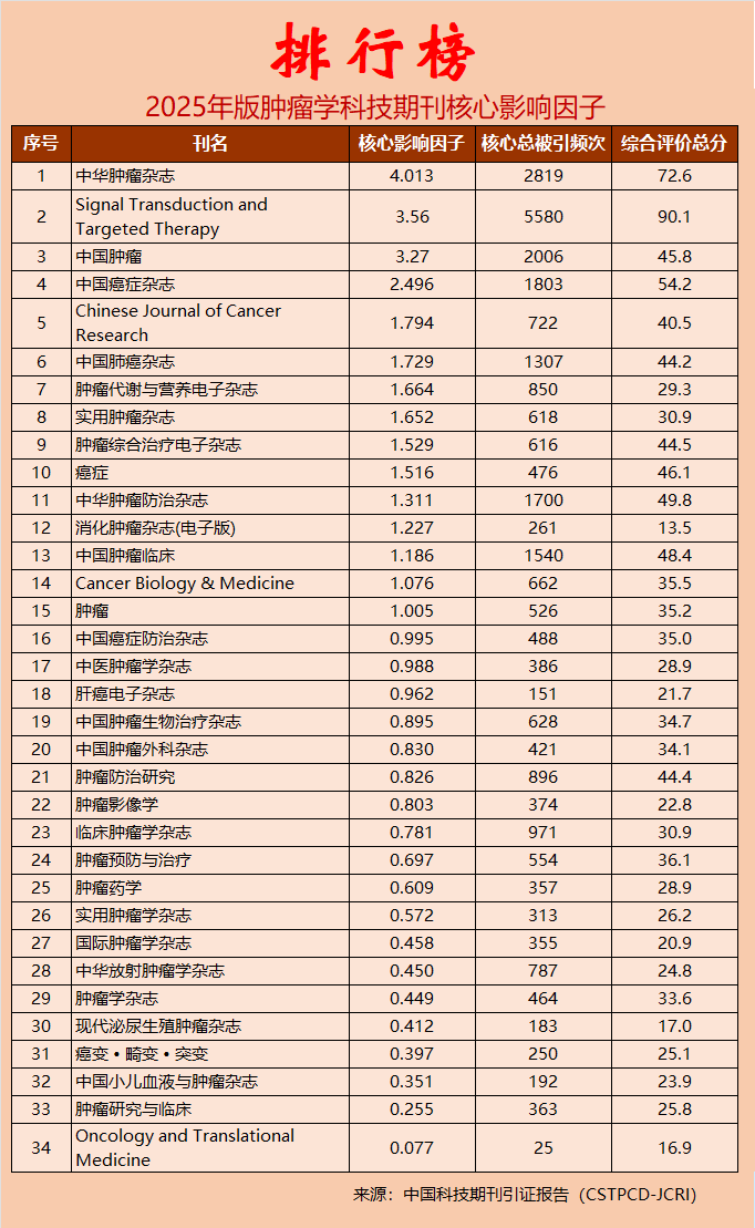 图1 2025年版肿瘤学科技期刊核心影响因子排行榜